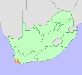 Range | This subspecies is endemic to the Western Cape Province in South Africa, it is found on the Cape Peninsula, the Cape Flats (Kanonberg), Hottentots Holland to Franschhoek Mountains, Kogelberg, Kleinmond, Babilonstoring and Kleinrivier Mountains to Stanford. |
